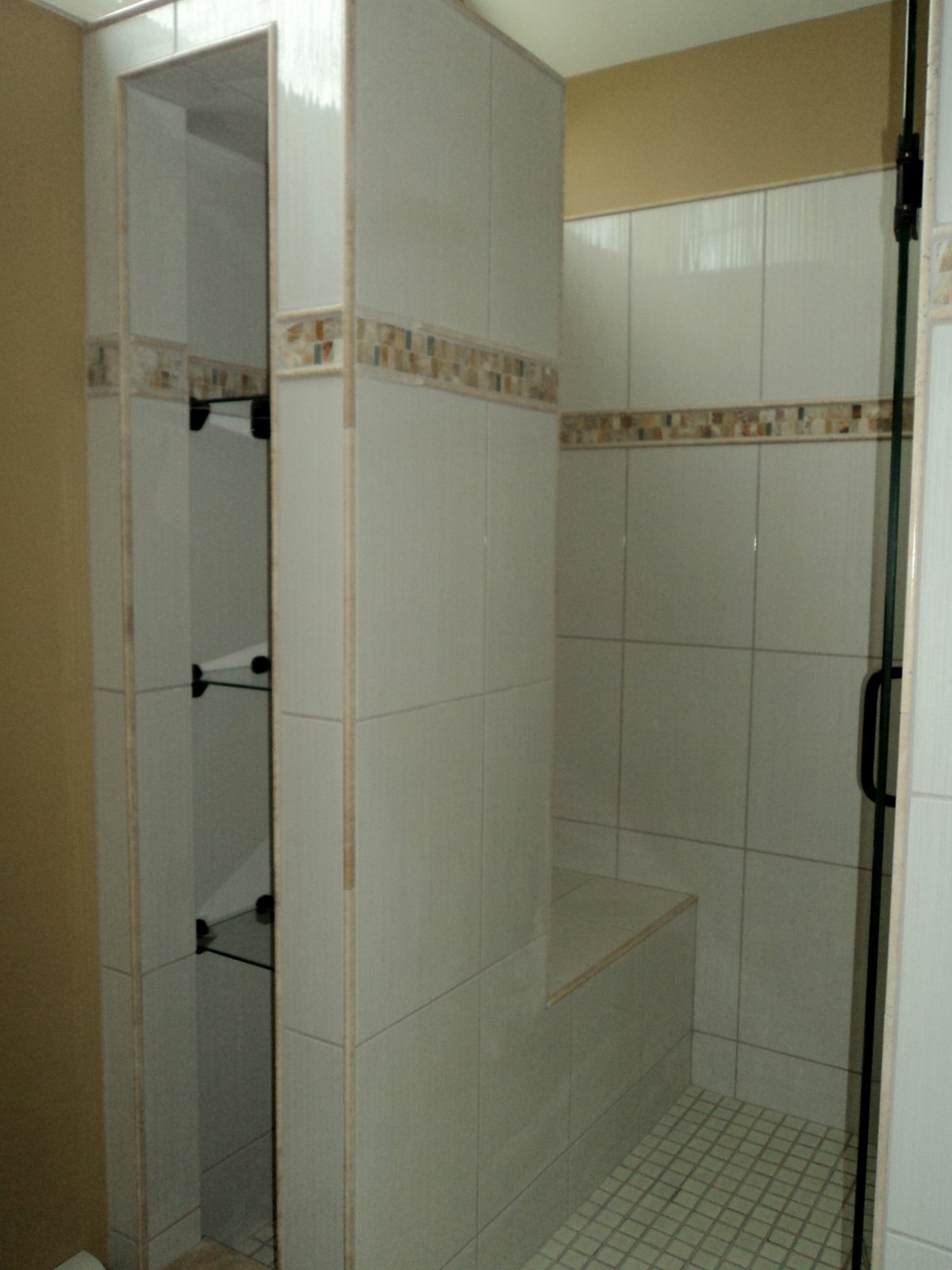 CARBONE – cont’d Published on April 9, 2013 Shower as seen from doorway to Bathroom. Closer view of linen storage and shower seat. Glass door and plumbing fixtures.