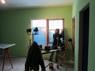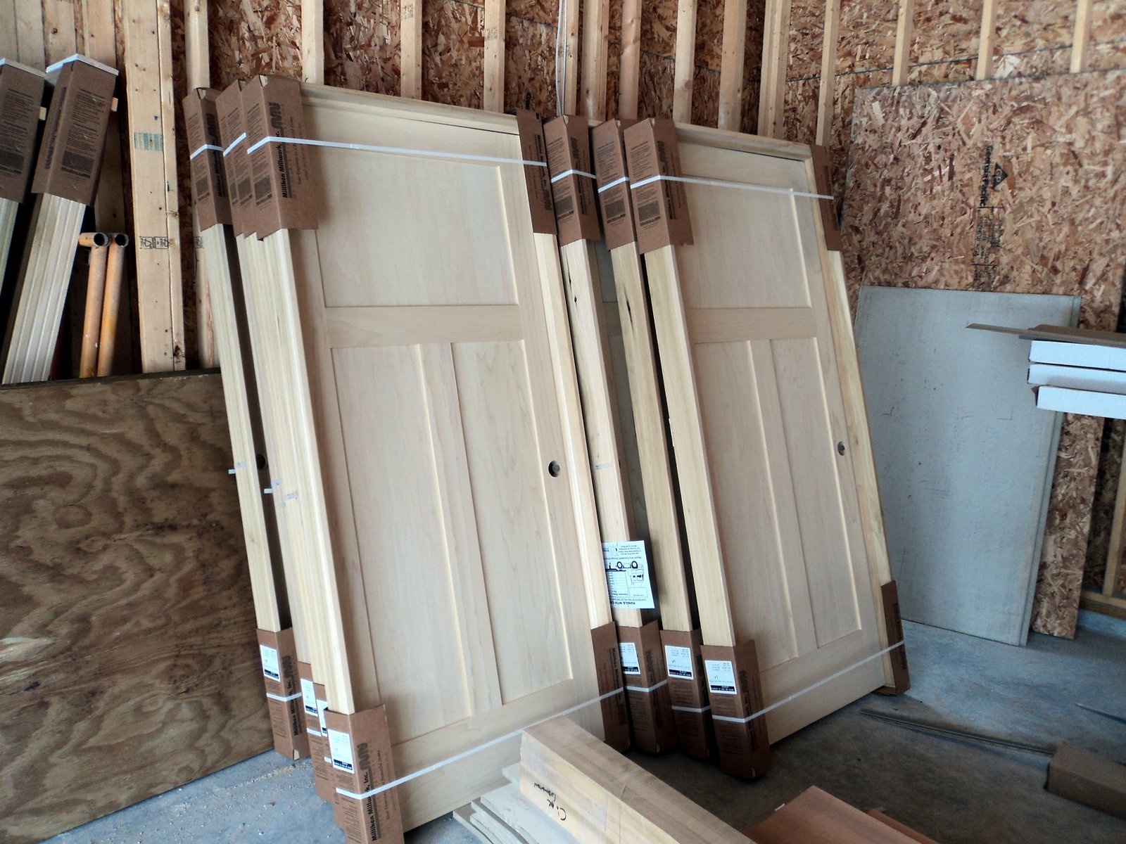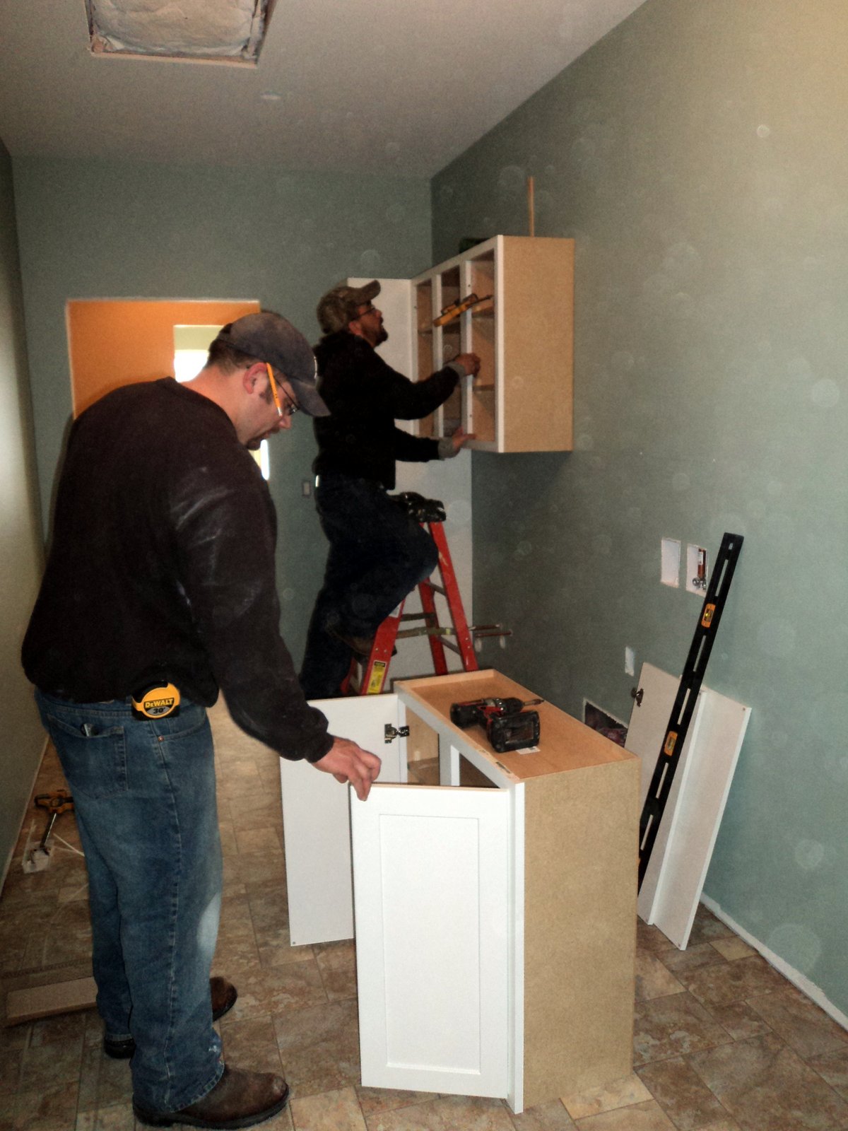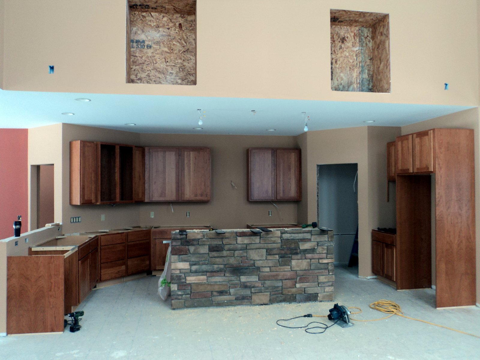 GOULD Published on March 1, 2013 Interior doors ready to be stained. Staining windows on the Main Level. Looking back at the Kitchen from the Great Room. Installing cabinets in the Laundry Room.