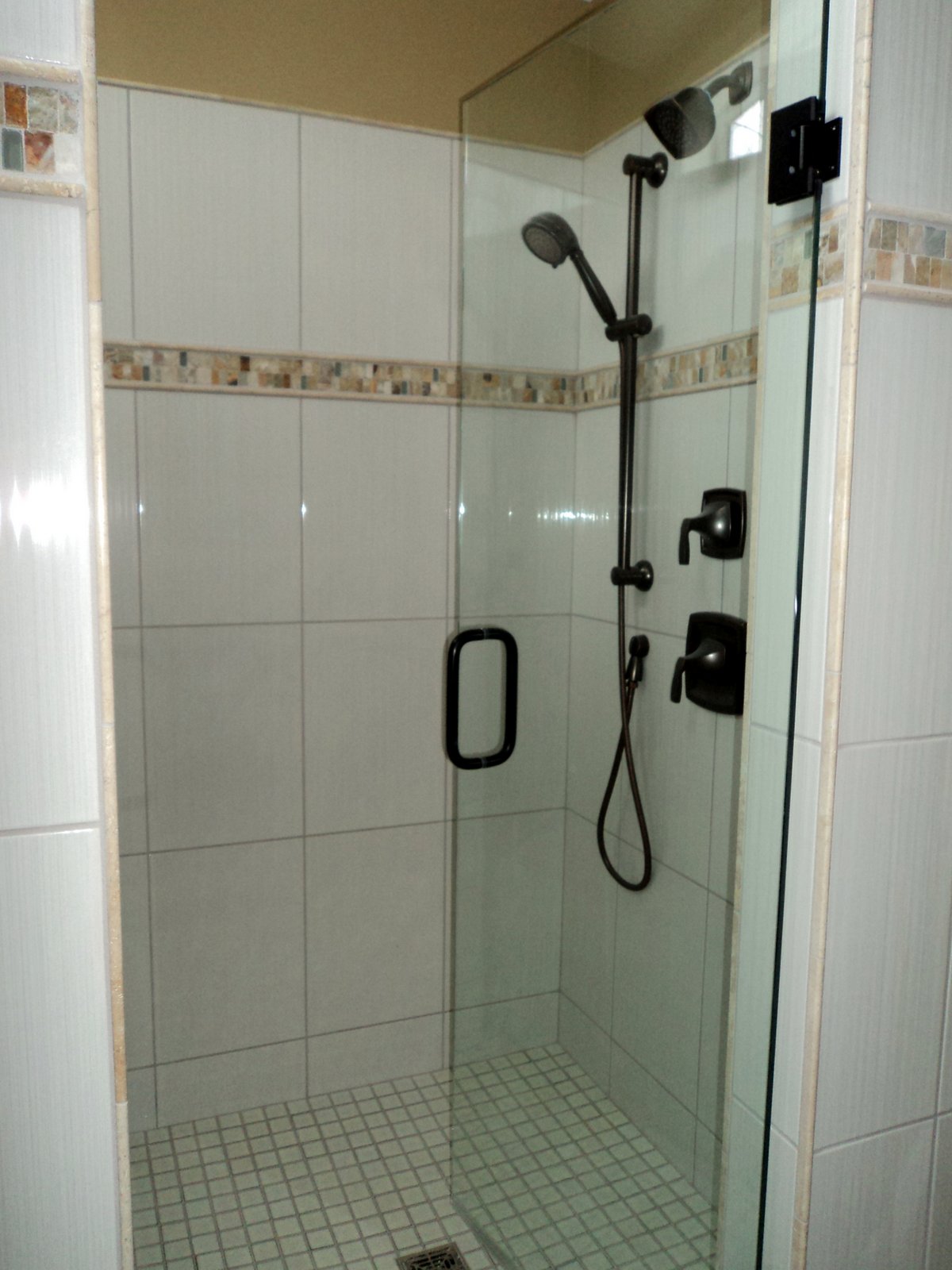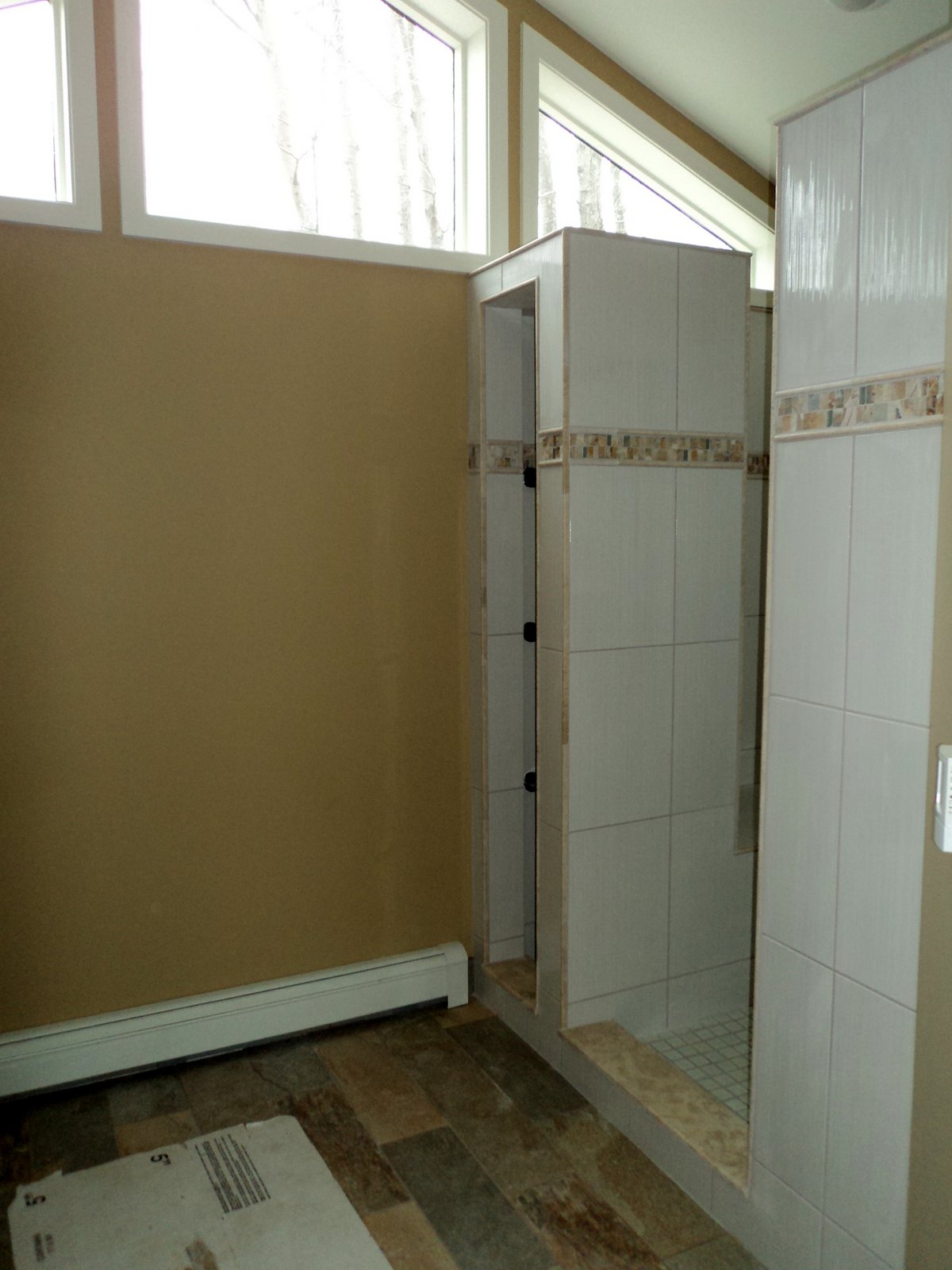 CARBONE – cont’d Published on April 9, 2013 Shower as seen from doorway to Bathroom. Closer view of linen storage and shower seat. Glass door and plumbing fixtures.